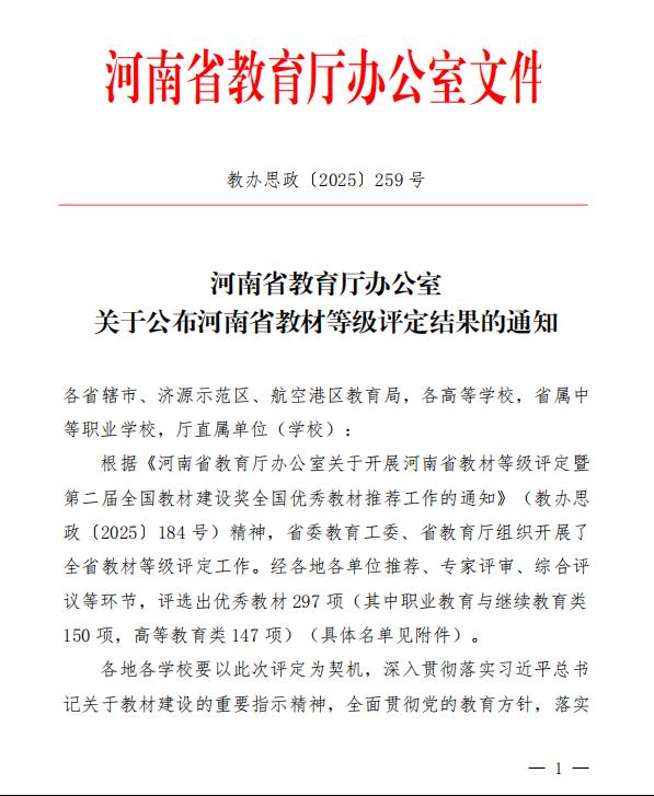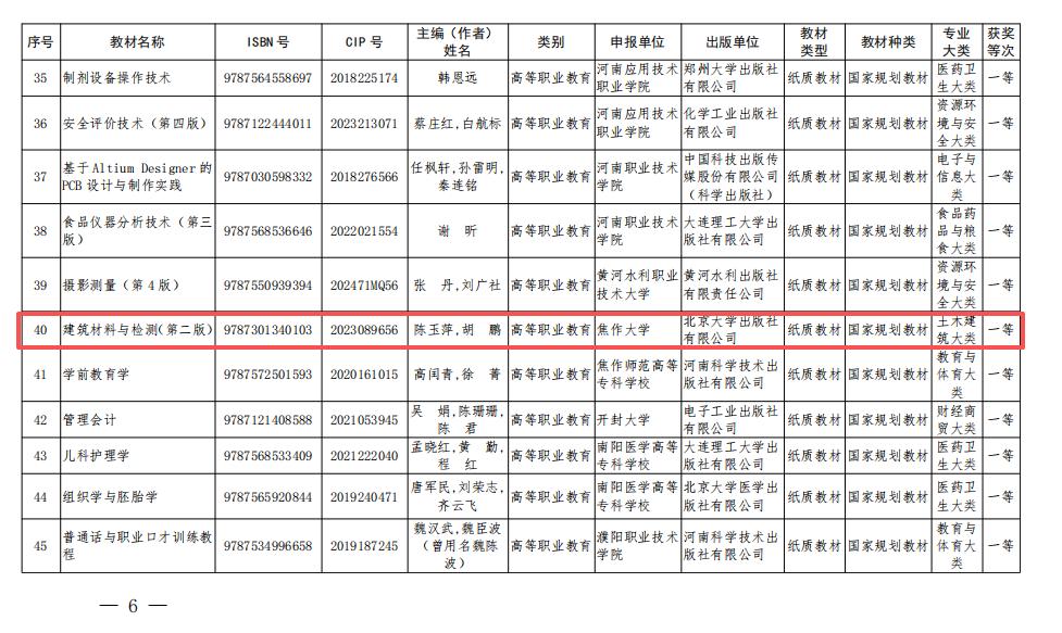 近日,河南省教育厅下发《关于公布河南省教材等级评定结果的通知》(教办思政〔2025〕259 号),我校陈玉萍、胡鹏主编的《建筑材料与检测(第二版)》入选2025年河南省职业教育与继续教育优秀教材认定名单,荣获一等奖。